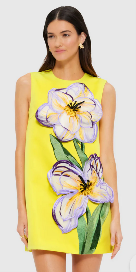 Yvonne Appliqué Floral Mini Dress - Iris Print in Yellow by LEO LIN