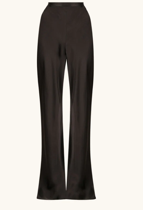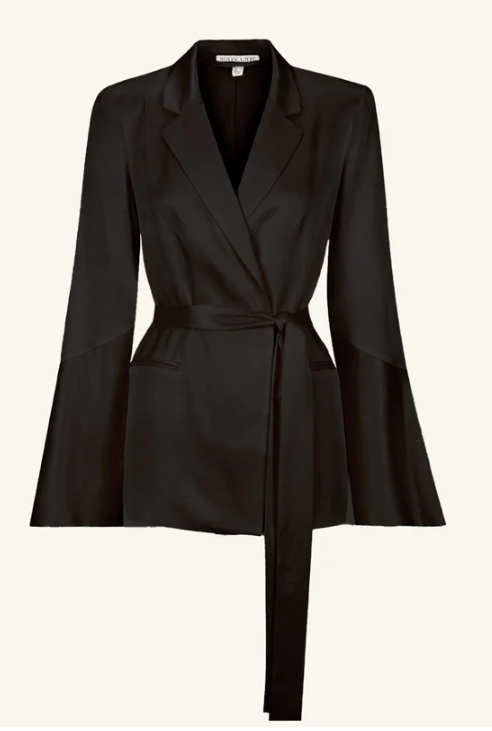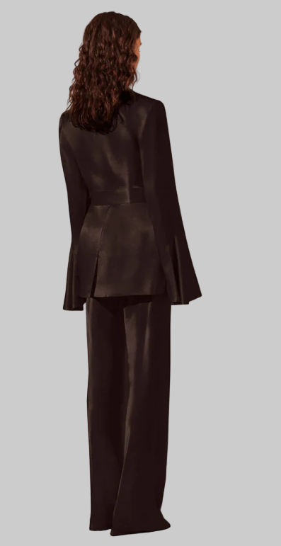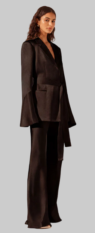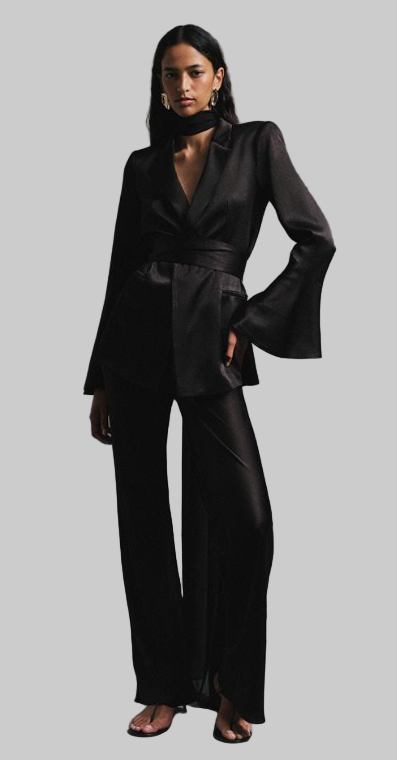 This elegant set features high-waisted black pants with a flattering flared leg and a bias cut, made from eco-friendly LENZING™ ECOVERO™ viscose with a soft satin finish. The matching black blazer has flared sleeves, a belted waist, pointed lapels, and welt pockets, also crafted from sustainable LENZING™ ECOVERO™ fabric. Both pieces are lined and made from medium-weight, non-stretch woven material that combines style with environmental care
