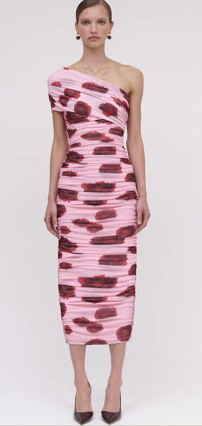 The Luca One Shoulder Midi Dress is a sophisticated showstopper, made with delicate mesh and decorated with a unique floral pattern in bold shades of red and pink. Its oversized off-shoulder fold adds a touch of contemporary flair while maintaining its versatile wearability. The ruched, bodycon design beautifully hugs your curves, making it a perfect choice for both daytime and nighttime events. This dress is a must-have for any occasion, combining daring fashion with timeless elegance. Lined and mid-length, it's truly a one-of-a-kind piece